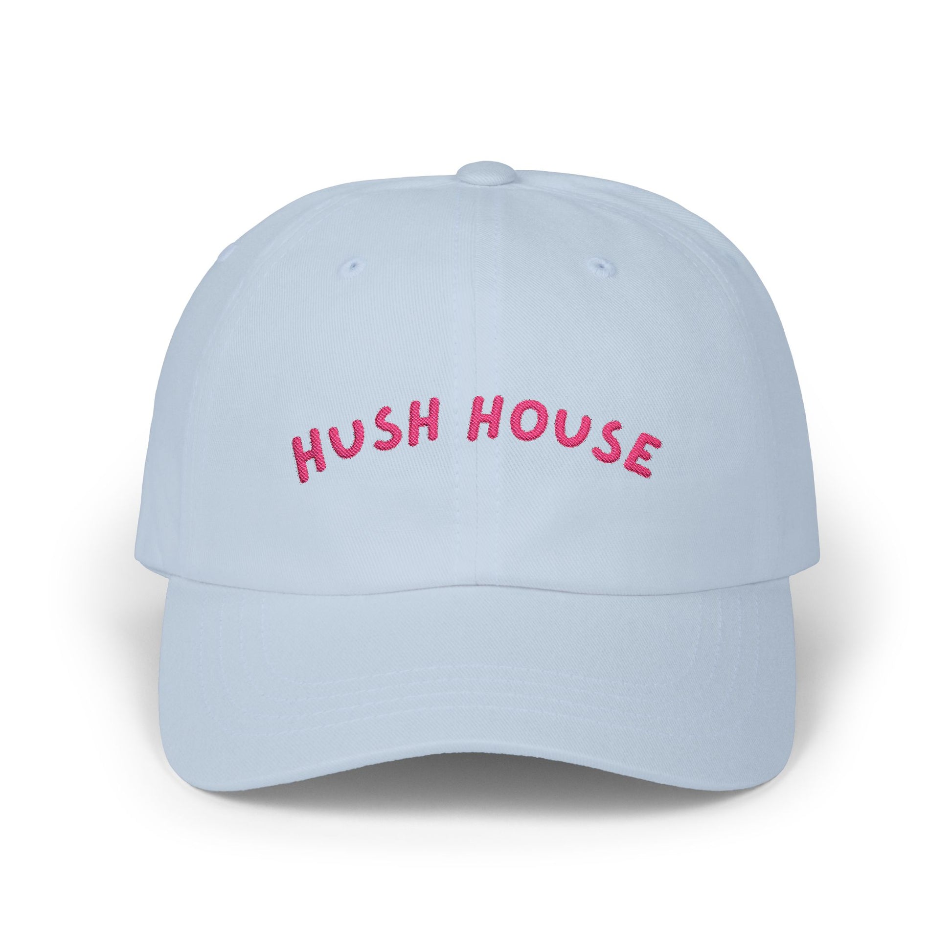 A classic Dad cap featuring the brand name 'hush house' on the front. This comfortable cap is perfect for everyday wear with its unstructured body and low profile. The adjustable snap closure ensures the perfect fit for adults, making it a stylish accessory for casual outings or outdoor activities. Ideal for Father's Day, birthdays, or as a gift for any cap enthusiast.